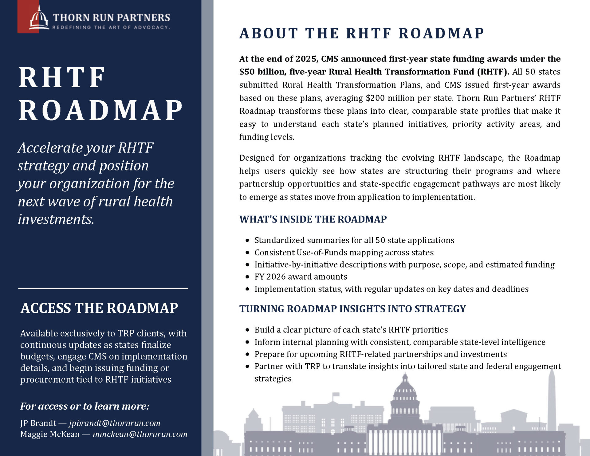 January 29, 2026In late 2025, CMS announced the first-year awards under the $50 billion Rural Health Transformation Fund (RHTF) after reviewing plans submitted by all 50 states. With wide variation across state proposals and priority activity areas, Thorn Run Partners is focused on helping clients interpret award levels, anticipate near-term activity, and identify where partnership opportunities are most likely to emerge.